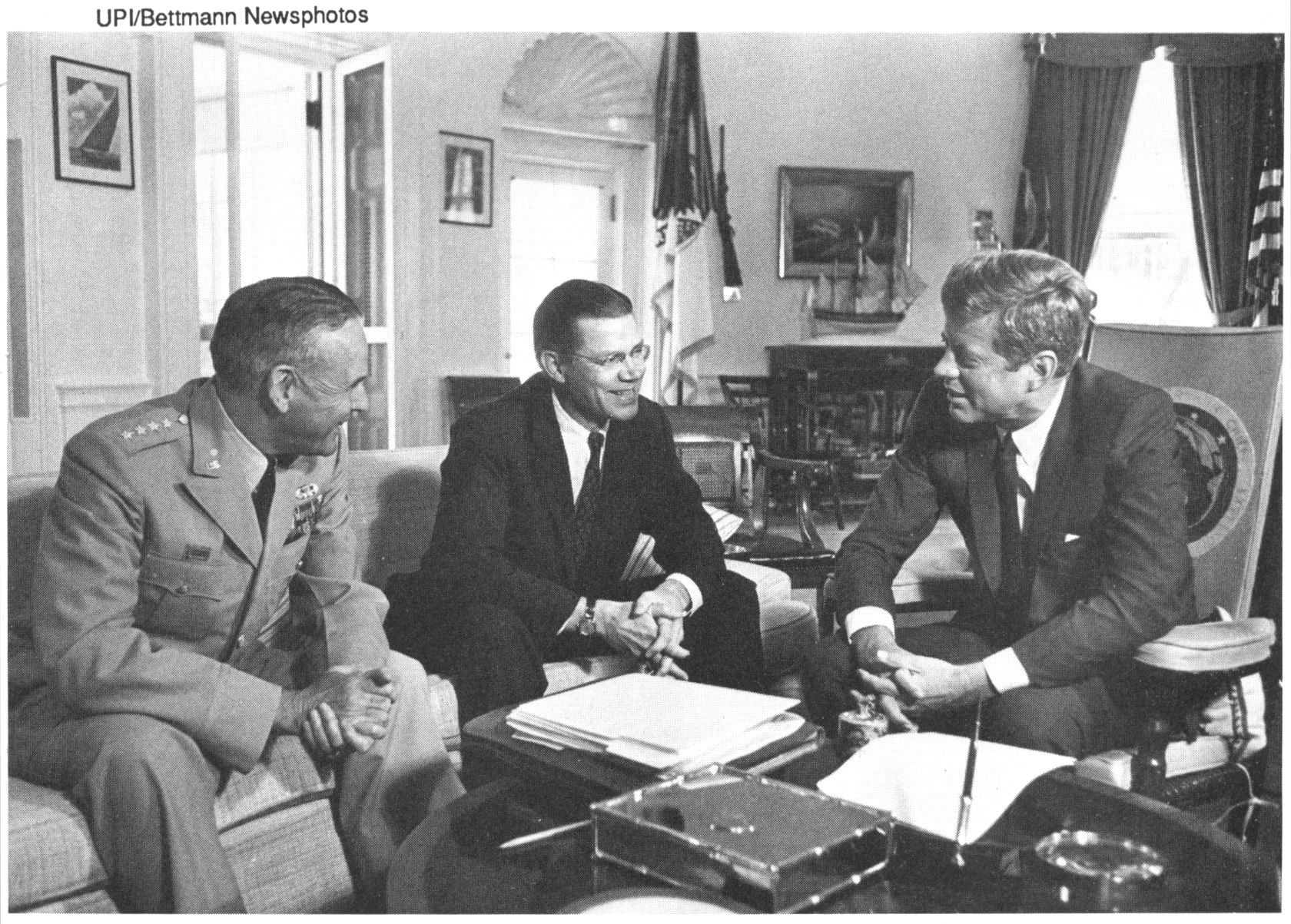 | And if anybody thinks that that huge report could have been written while they were running from one place to another in Vietnam—you see that big report on the coffee table in front of the President, and Maxwell Taylor and McNamara there, that is the report of the trip. They couldn’t have done that on the back of envelopes while they were running. And it was very carefully designed by Kennedy to support his Vietnam policy, you see. | |||||
